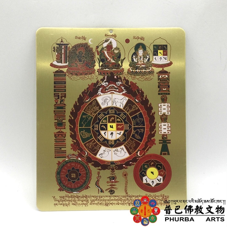 佛教藏密吉祥八卦九宮咒輪(文殊九宮八卦)由西藏密宗開山祖師─蓮花生大士,為慈悲一切眾生于世間因受時空、方位不吉祥所生障難,特聚集梵、藏、漢三地破除各種凶煞之鎮宅安居妙寶而成。文殊九宮八卦分解圖說中央上方是佛教密乘主掌智慧、慈悲、力量的智、仁、勇、三族姓尊觀音、文殊、金剛手等三大菩薩。其左為時輪金剛咒輪,令上、下、東、南、西、北四方、四隅,與年、月、日、時等的時空宇宙組合世界一切自在。其右方是防護一切凶煞、障礙、驅不祥的回遮咒輪。正中分為三圈:外圈是十二生肖,是代表十二地支以紀年的十二種動物,配合天干演化成六十甲子;中圈是卦為乾、兌、离、震、巽、坎、艮、坤、代表天、澤、火、雷、風、水、山、地、等人種事物;內圈是按龜背的九格,分為九數,第一宮為白色,象徵藥物,第二宮黑色,象徵魔,第三宮碧色,象徵水,第四宮綠色,象徵龍,第五宮黃色,象徵戰神,第六宮白色,象徵君主,第七宮赤色,象徵妖,第八宮白色,象徵地祉,第九宮紫色,象徵火。五行相配,三白屬金,黑與碧屬水,綠色屬木,黃色屬土,赤色屬火,此圓總括一切時間、方位、風水、地理。圈外有一怒目、獠牙、卷舌的四手凶神,就是掌理日月星宿、年、月、日、的羅侯俗稱太歲星君。右下方的咒輪是一切音聲的韻母,及緣起咒,作為增長善緣,福德,吸取天地、日月的精華。左下方的咒輪是作依陰陽五行九宮遮止咒輪,能回遮一切違逆之緣。專業的承銷、承諾最安心的選擇