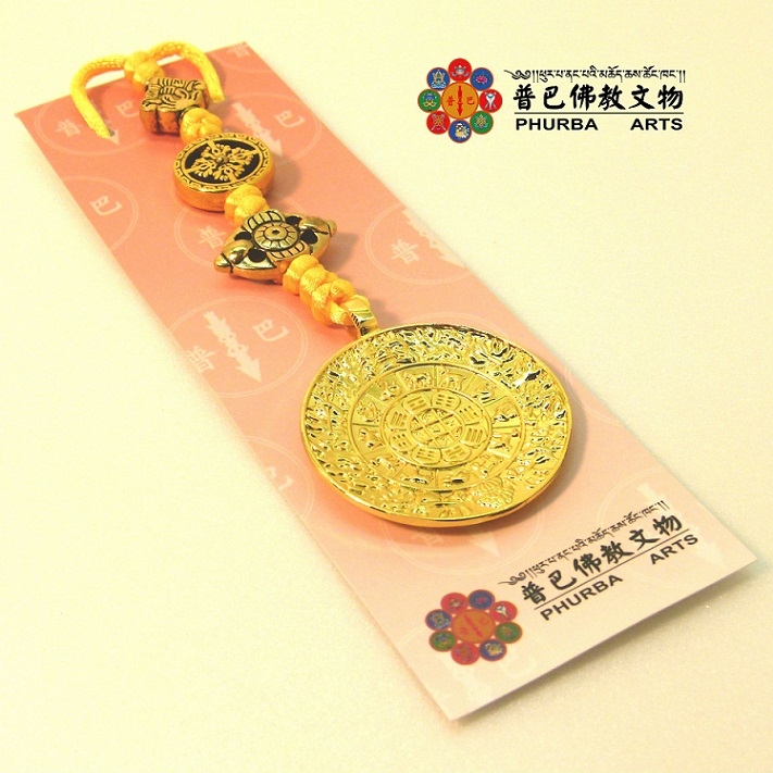 正中分為三圈:外圈是十二生肖,是代表十二地支以紀年的十二種動物,配合天干演化成六十甲子;中圈是卦為乾、兌、离、震、巽、坎、艮、坤、代表天、澤、火、雷、風、水、山、地、等人種事物;內圈是按龜背的九格,分為九數,第一宮為白色,象徵藥物,第二宮黑色,象徵魔,第三宮碧色,象徵水,第四宮綠色,象徵龍,第五宮黃色,象徵戰神,第六宮白色,象徵君主,第七宮赤色,象徵妖,第八宮白色,象徵地祉,第九宮紫色,象徵火。五行相配,三白屬金,黑與碧屬水,綠色屬木,黃色屬土,赤色屬火,此圓總括一切時間、方位、風水、地理。圈外有一怒目、獠牙、卷舌的四手凶神,就是掌理日月星宿、年、月、日、的羅侯俗稱太歲星君。右下方的咒輪是一切音聲的韻母,及緣起咒,作為增長善緣,福德,吸取天地、日月的精華。左下方的咒輪是作依陰陽五行九宮遮止咒輪,能回遮一切違逆之緣。