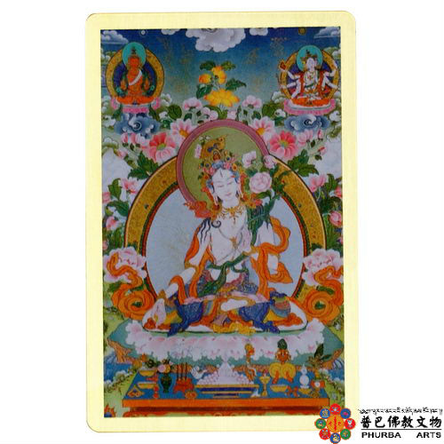 白度母-銅箔隨身唐卡/護身卡(金)隨身攜帶,改善運勢業障糾纏尺寸 : 8.6 X 5.5 公分信用卡大小,可放皮夾每張銅箔隨身護身卡都有經過護貝加強保護背面印有相關咒文及解說白度母又稱多羅菩薩(多羅,意為「眼」、「妙目睛」、「瞳子」、「極度」、「救度」;Drolma;卓瑪,意為「救度」),又譯為多羅母、多羅佛母、度母、救度佛母。佛教認為多羅菩薩是阿彌陀佛、觀世音菩薩化身的女性菩薩,因此,有時佛教經論又作多羅觀自在菩薩、多羅觀音。本願漢傳記載的發願《大方廣曼殊室利經(觀自在多羅菩薩儀軌經)》不空三藏法師翻譯觀自在菩薩入於普光明多羅三昧中,從其面輪右目瞳中放大光明,隨光流出現多羅菩薩,多羅菩薩普告大眾說:「誰在變苦,誰在流溺生死海中,我令誓度!」藏傳記載的三次發願《尊聖多羅菩薩傳:正信種子》多羅那他尊者編著第一次發願:在無量劫前的「種光世界」鼓音如來出世,有一公主名「般若月」,天生善根深植,禮敬三寶,那世界的人們壽命極長,般若月公主至心供養佛弟子長達一百萬零八年,每日以無數珍寶瓔珞供養,諸比丘眾都讚嘆祂道:「您如此恭敬虔誠,今生必然獲得正果,若是能至心於佛前發願,一切所願必能成就,那麼您何不發願轉變女身成男,方便修行呢?」般若月公主就說云:「我觀此處無男亦無女,無人無識亦無我,男女名稱皆虛假,世間劣智迷惑生。」藉著繼續說道:「從來以男身修行佛道的人是很多的,可是以女身修行佛道的卻很少。所以我今日於佛前發願直至虛空界毀壞之時,我都以女身度化一切眾生。」第二次發願:多羅菩薩(度母)又曾經在不空成就佛面前,發願曰:「願我能護持十方一切苦難的眾生,並且降服一切魔障,從此九十五大劫中,每天都能度化百萬眾生,使其身心安穩快樂。」諸佛感佩祂的願行,故賜名「多羅」菩薩,以其能度化眾生、施予無畏的緣故。第三次發願:大悲觀自在菩薩無量劫來救度眾生,但是眾生仍然常溺五欲生死苦海、輪迴六道受無量諸苦,菩薩因為悲憫蒼生而不由得悄然落淚,當此之時雙眼的眼淚頓時各變現出綠多羅菩薩和白多羅菩薩,各自合掌恭敬向觀自在菩薩同聲說道:「菩薩,您不要擔心,我等誓度一切流轉生死苦海的眾生,為菩薩分擔救度眾生的悲願。」因此,多羅菩薩是觀自在菩薩悲淚的化身。