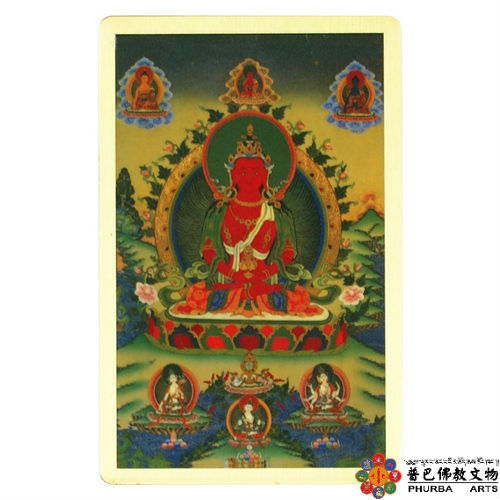 長壽佛-銅箔隨身唐卡/護身卡隨身攜帶,改善運勢業障糾纏尺寸 : 8.6 X 5.5 公分信用卡大小,可放皮夾每張銅箔隨身護身卡都有經過護貝加強保護背面印有相關咒文及解說長壽佛長壽佛本來就是阿彌陀佛的化身,我們唸佛是唸「南摩阿彌陀佛」,道家是唸「無量壽佛」,其實祂是無量壽跟無量光,綜合起來祂就是阿彌陀佛。阿彌陀佛本身的變化是長壽如來,長壽如來是祂的一個變化。長壽如來有祂的手印,跟彌陀定印是一樣的,也有祂的咒語,還有祂的觀想。長壽如來是紅色的,阿彌陀佛在西方也是紅色的,一樣是紅色的。修長壽佛法時,特別觀想祂的手上有一個長壽甘露水瓶,要觀想長壽佛住你的頂,然後甘露瓶的水一滴一滴灌入你的身中,讓你身體所有的業障,甚至死兆,變成黑色的水從你的毛細孔流出去。觀想完了,你要唸長壽佛的咒。在觀想的同時,要結長壽佛的手印,這是長壽佛的修持法。修長壽佛法,最主要的要觀想祂住頂,甘露瓶中的長壽水,由你的中脈一直流下來到三脈七輪,甚至於微小的輪脈,充滿全身,讓全身黑色的水流出去,你就可以得到長壽。